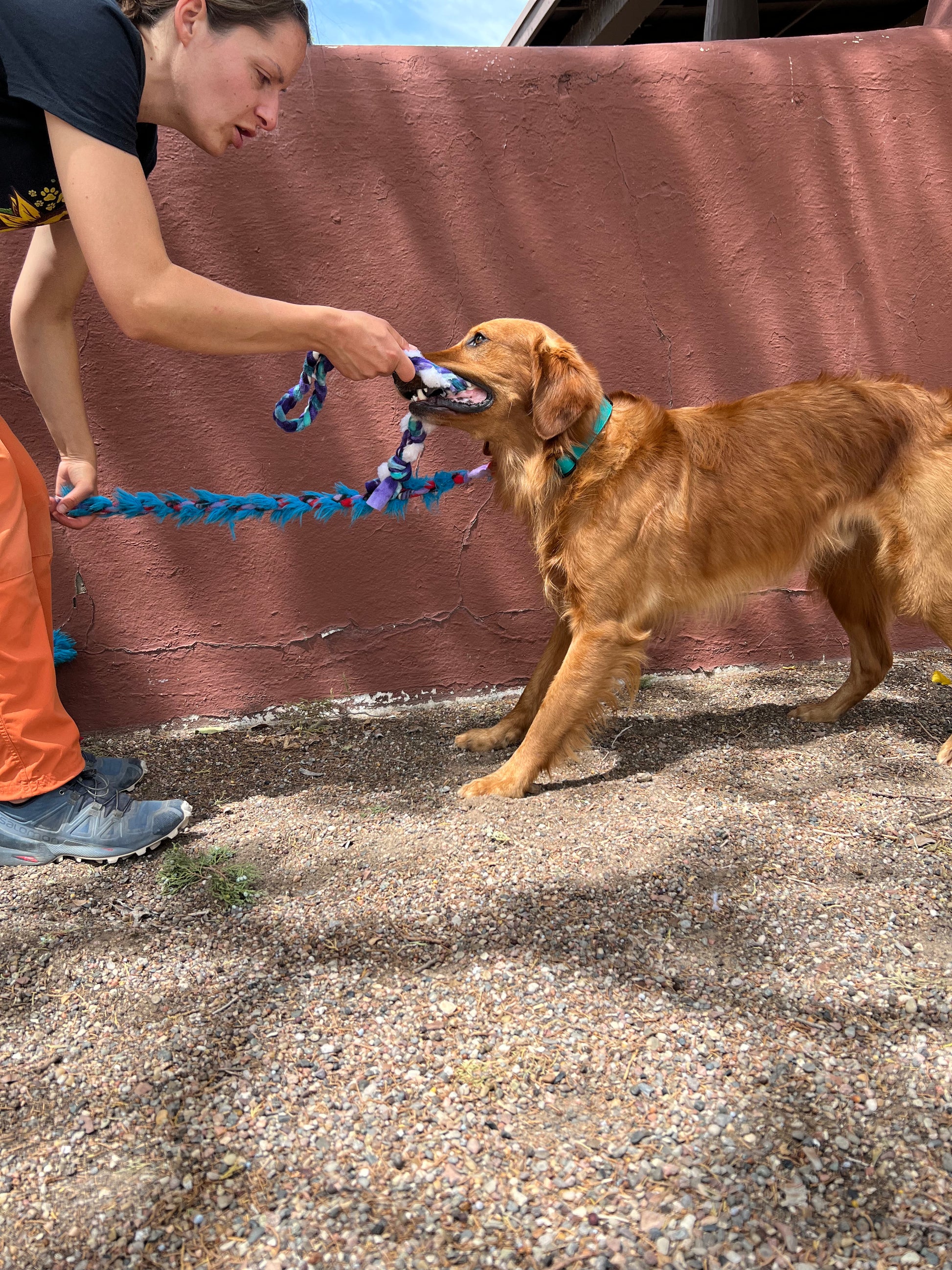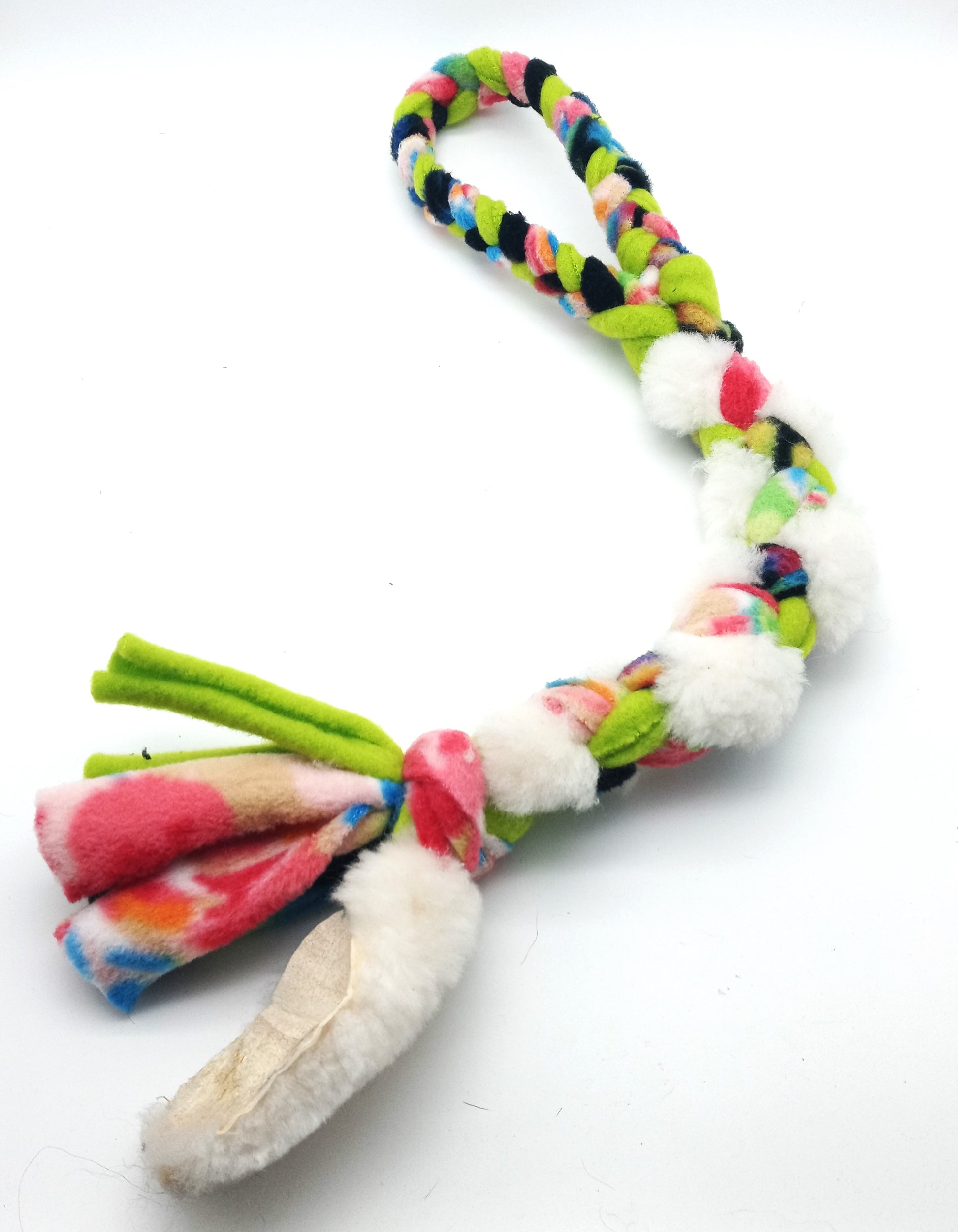 This braided fleece tug is made with wide strands of fleece and an added sheepskin strip through the middle. The large knot at the end is great for the pups to grab. The soft fleece handle makes it fun for you, too. Tough and long lasting. Use interactively with one or multiple dogs. It can be used to play fetch or as a tug toy. Playing with your pup helps alleviate stress and boredom and strengthens your bond.