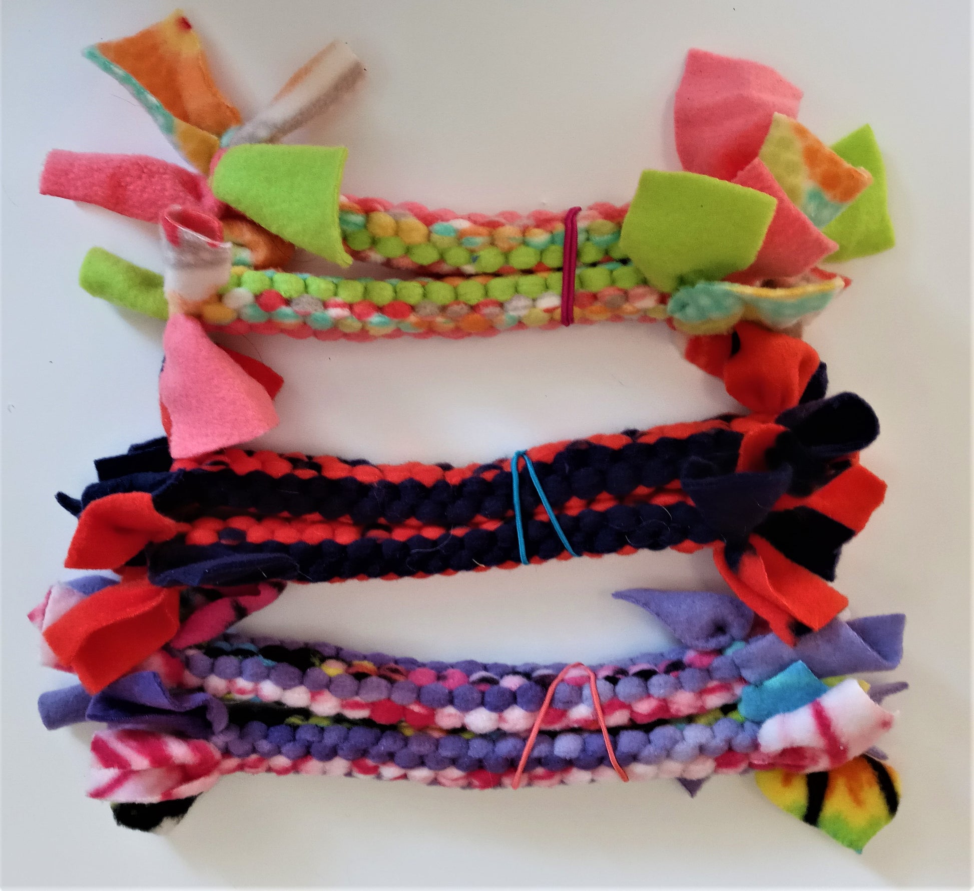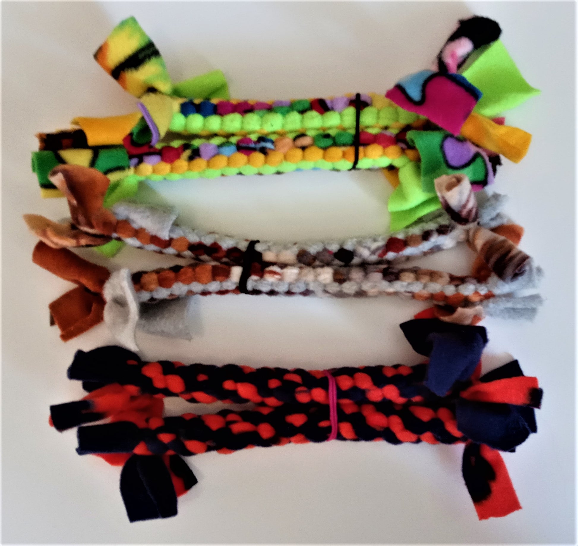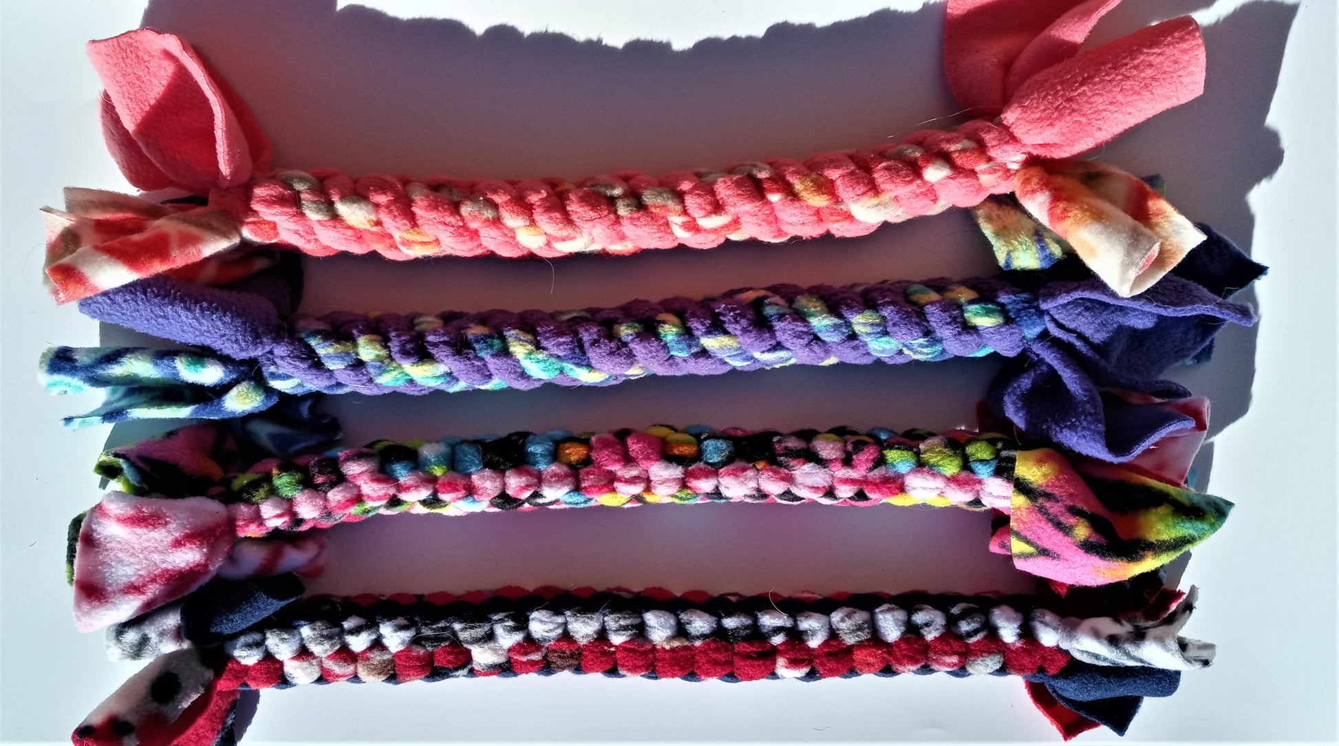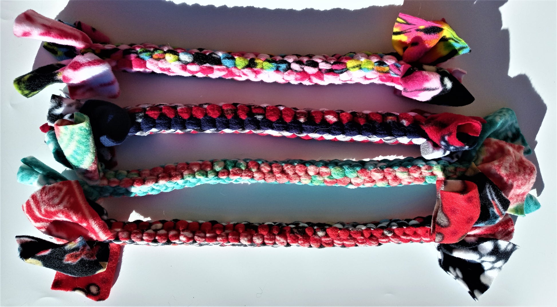 Hand Knotted Fleece Tug Toys – These are designed to be soft on your pups mouth, have some movement and flexibility. They are sure to please both you and your pet. Pups love to chase, fetch and tug with these toys. Multiple colors available! They are tightly woven and do not fray. With tugging, the item will stretch.