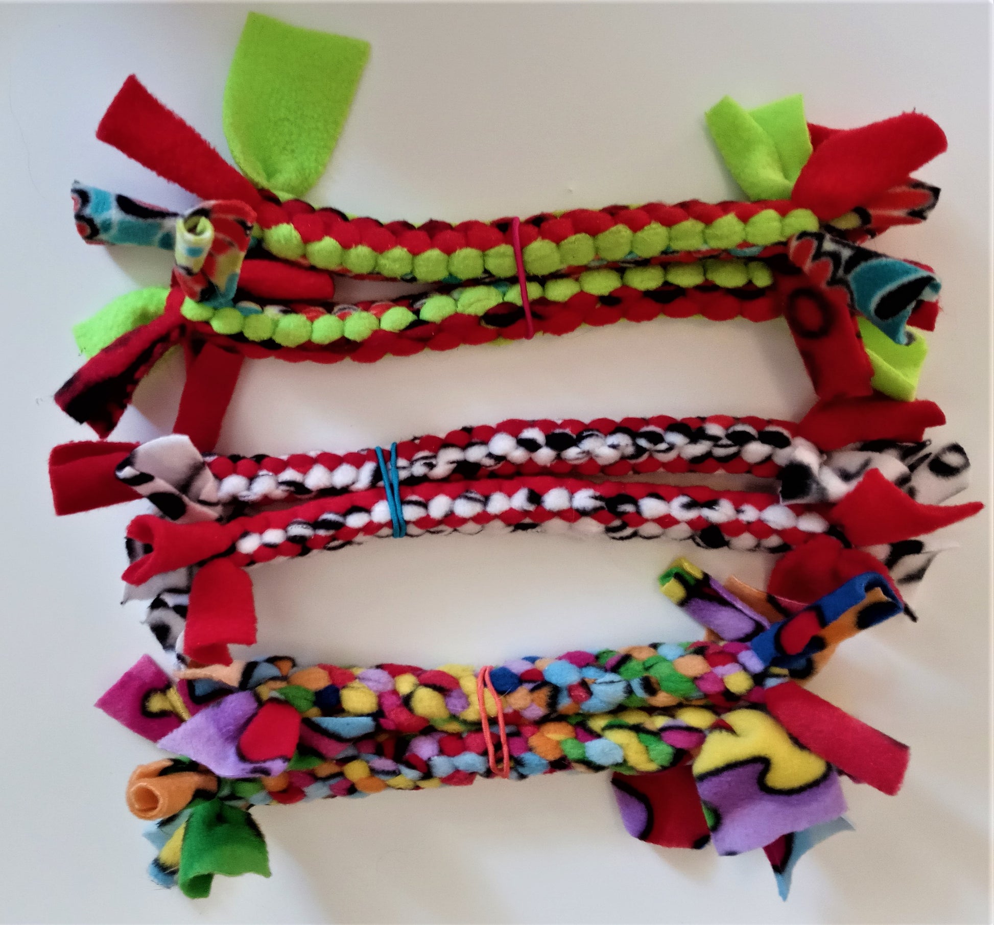 The small braided fleece tugs come in a matching set of two and measure approx. 1.5” diameter and are about 12” long.