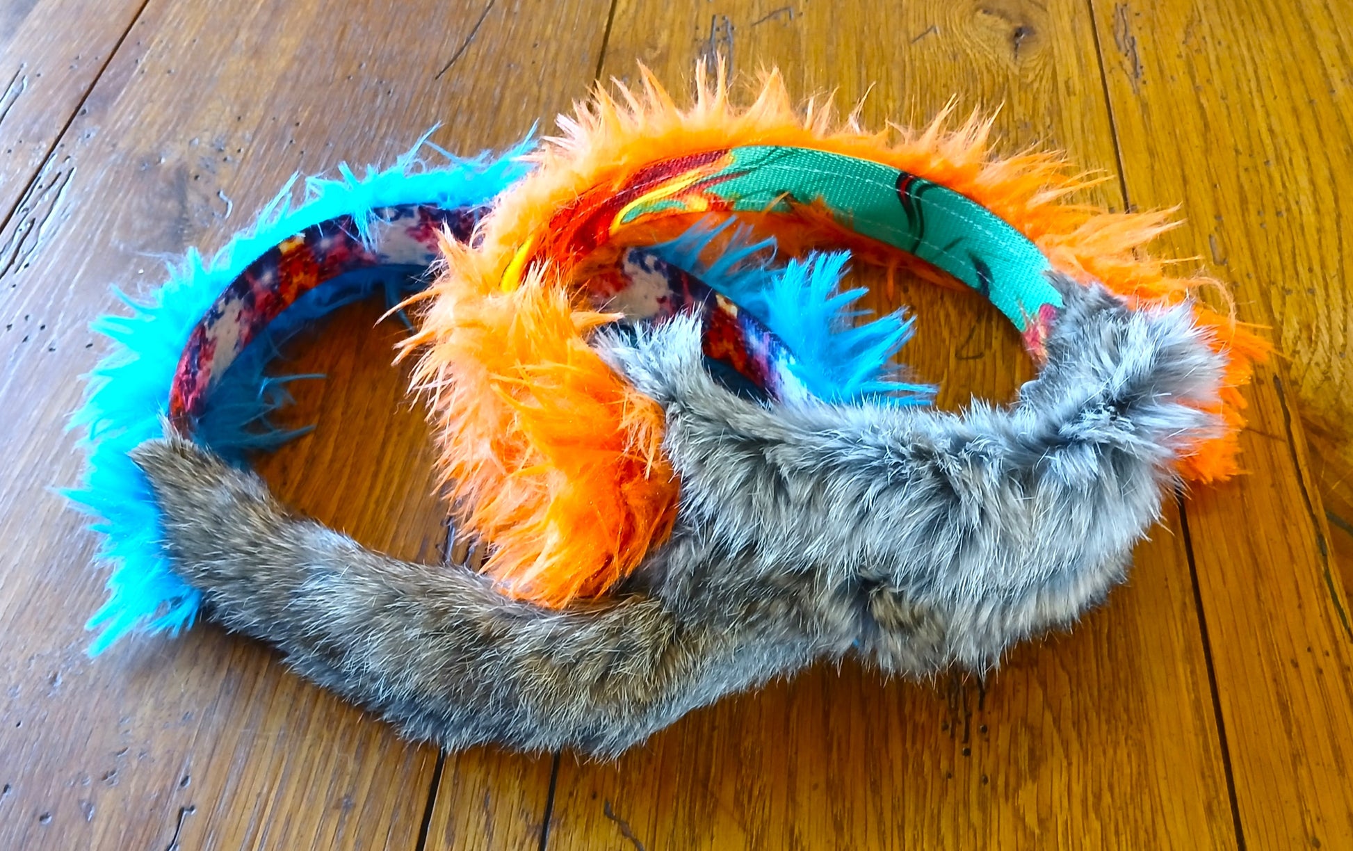 The ring is approx. 22” around with the rabbit hide covering just under ½ and the fluffy fun “fur” covering the other half.