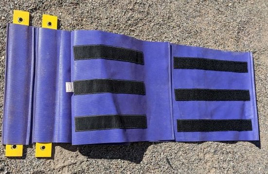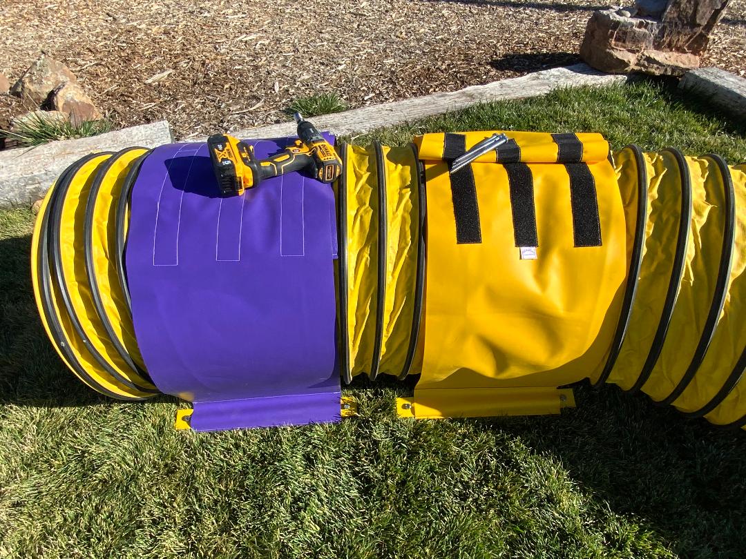 Keep those tunnels in place without all the heavy lifting of a tunnel bag! Made from heavy duty marine vinyl. The length of the Velcro allows them to fit tunnel sizes from 22” diameter to 26” diameter. Each snuggler set is held in place by two ¼” thick, 19” x 2” steel bars finished in bright yellow for high visibility. Each bar is held in place by 2 - 3/8” x 8” zinc coated lag screw. The long lag screws work perfect on turf, dirt and sand fields.